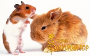 Я принимаюсь чистить клетку с красным поддоном. Меняю подстилку. Насыпаю корм. И понимаю, что в клетке у меня живут вот такие два пушистика, как на картинке — кролик и хомяк. В реальности же у меня ни одного, ни второго нету. Только два сторожевых мини пига — мопсы.
